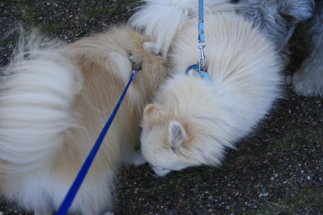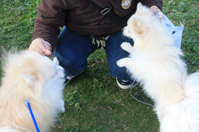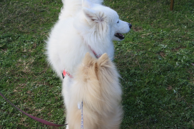 白い子が少しガウガウとなってしまい、飼い主さんに怒られてしまいました。