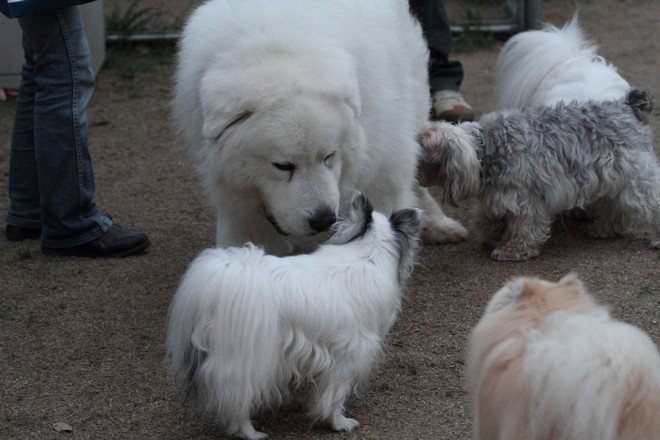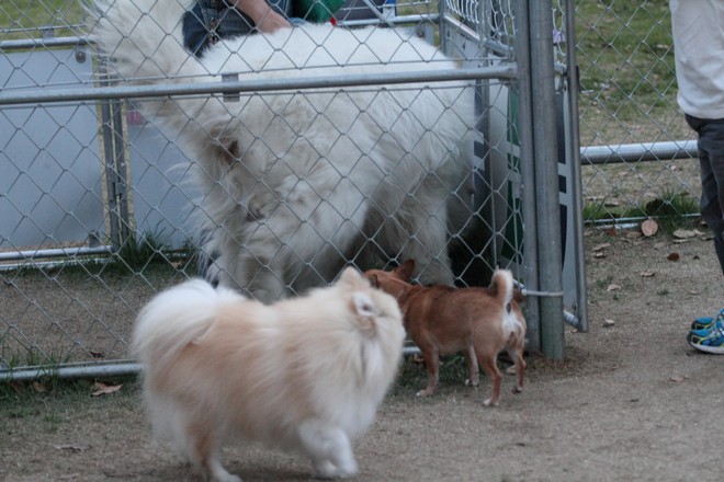 初めは小型犬ばっかりだったランに巨大な白いワンコがやって来ました。