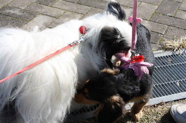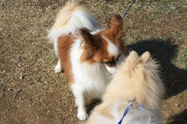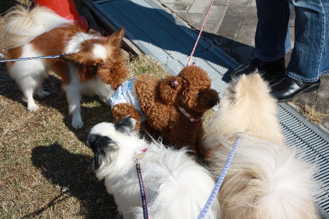 パピヨン飼いのご夫婦と話をしていると、どこからともなくワンコが集まってきました。