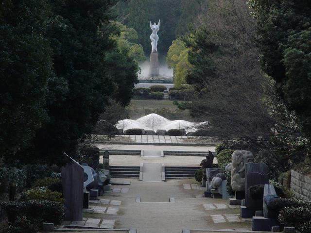公園に入る前の茂みや、遠くに噴水が見える写真