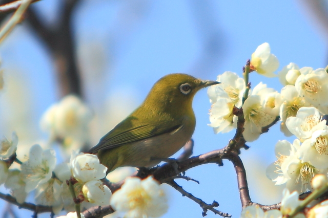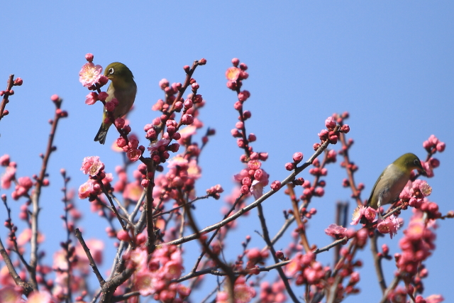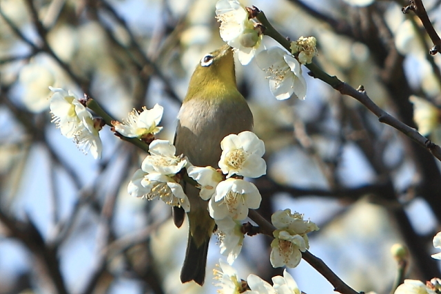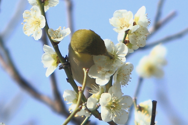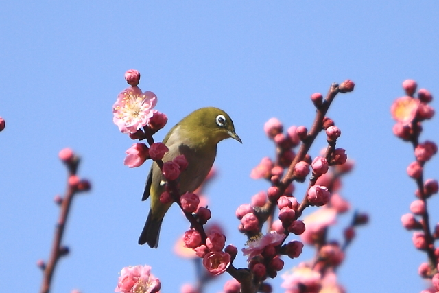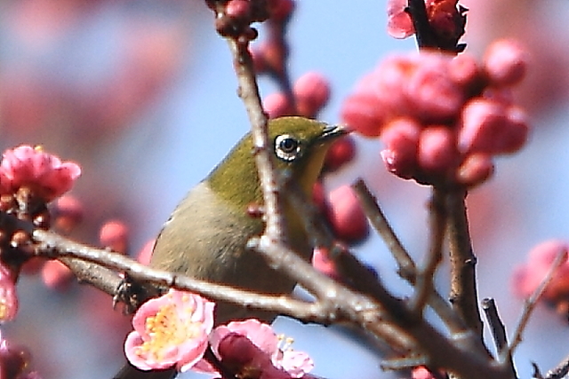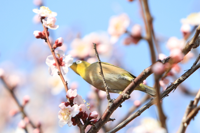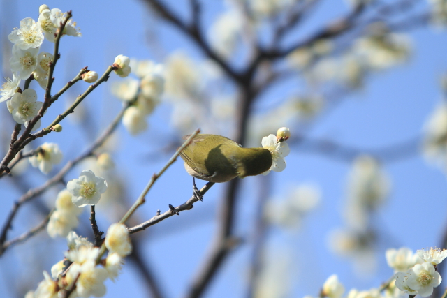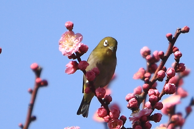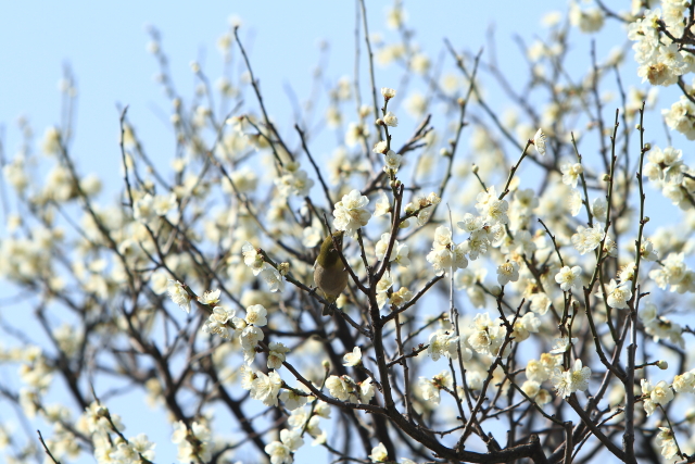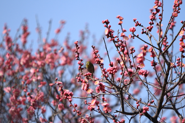 移動しながら梅を撮っていると、どこからともなく鳥の鳴き声がしてきました。