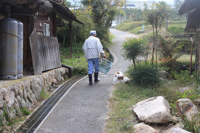 この藁葺き屋根の家の前で畑に向う途中のパピヨンと挨拶。