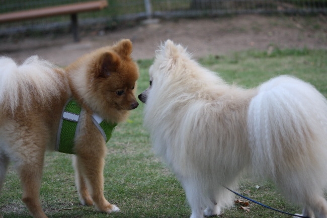 ジョンと挨拶するポメ雄君(仮名)