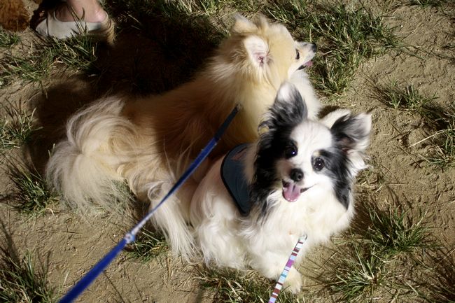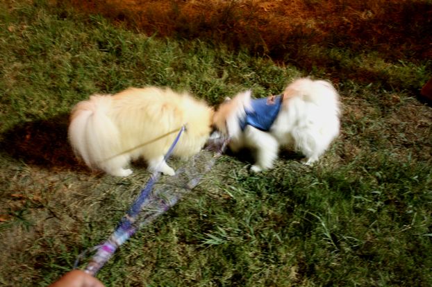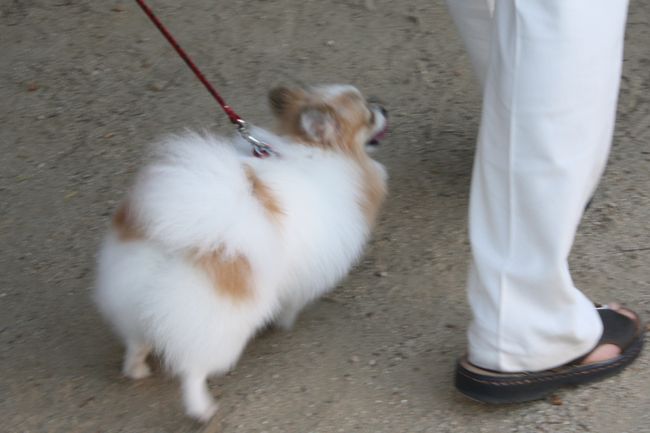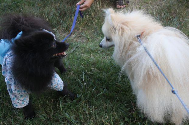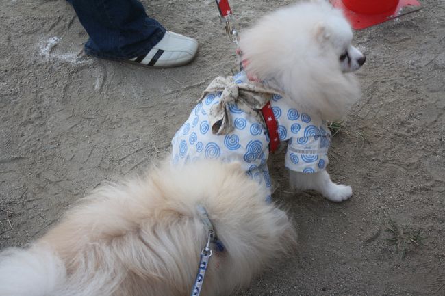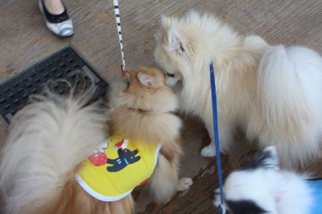 ジョンはお約束でご挨拶ですけど、白ポメちゃんは固まってしまいました(^^;)