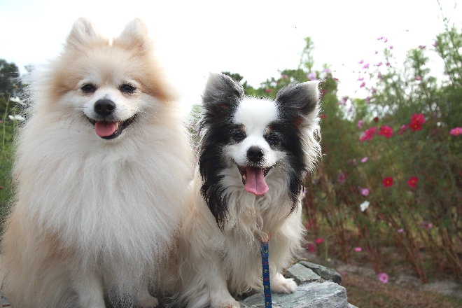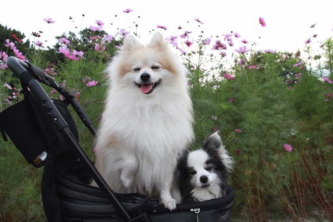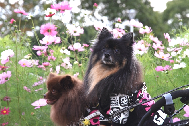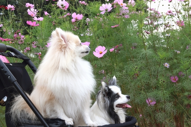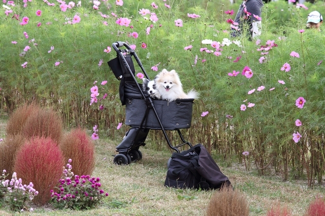 カートに乗せてコスモスを撮っていたら、なんと2回も「お疲れ様でした~、また!!」とお別れしたがんちゃんさんちもコスモスと愛犬を撮影されていましたw
