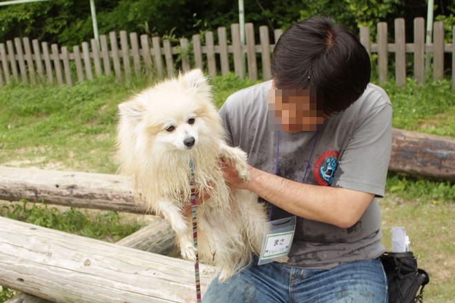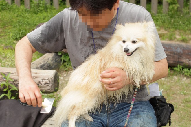 とりあえず下半分だけ洗い(ゼロママさん、バスタオル助かりました)、広場に戻ってきましたがジョンも自分もベチャベチャ(^^;)