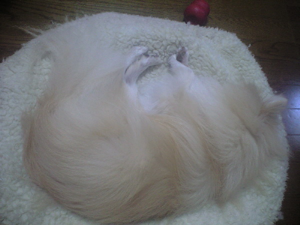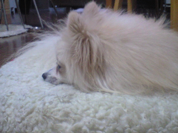 リビングではジョンはマザークッションかソファの上、パピはラグかフローリングの上で寝ている事が多いのですが、ジョンがトイレに行った隙にパピがマザークッションで寝始めました。