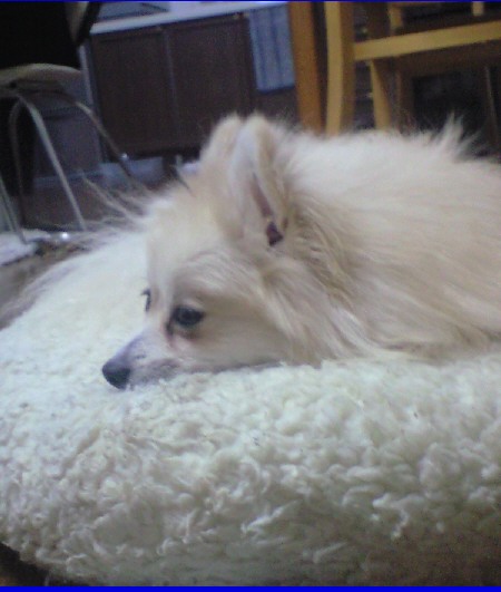 ↓ワンコ(小型犬)用キングサイズベッドにポツンと残されたパピ(笑)