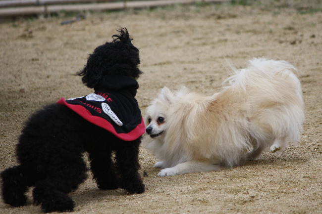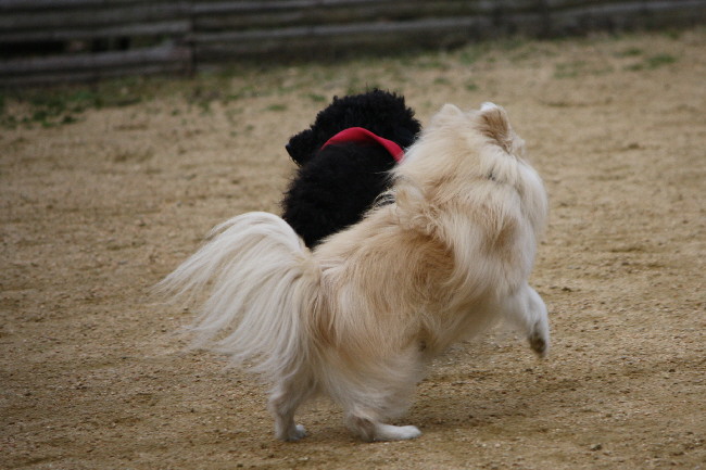 ジョンはクオーレ君とも変な声を出しながら(爆)遊んでいたんですが、お初のこのトイプー君の事が気に入った様でこうして遊ぶのを誘っていました。