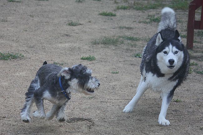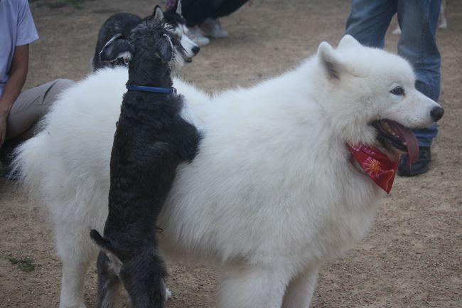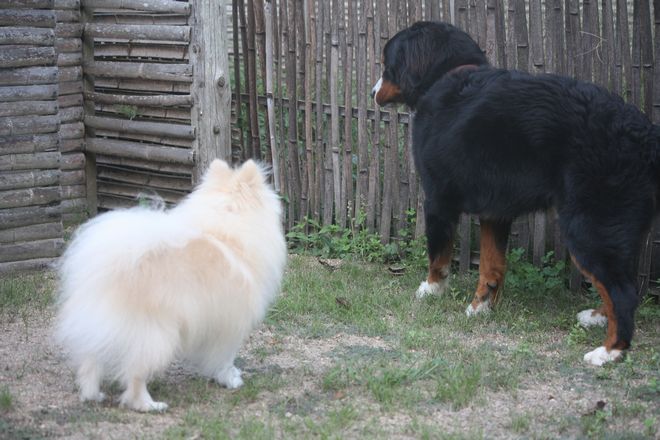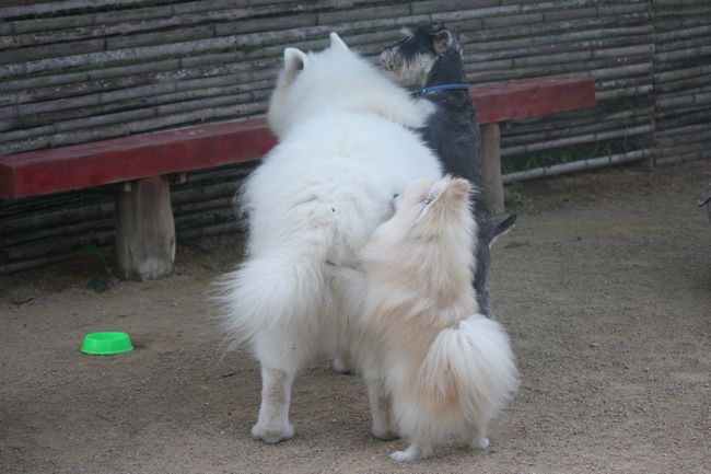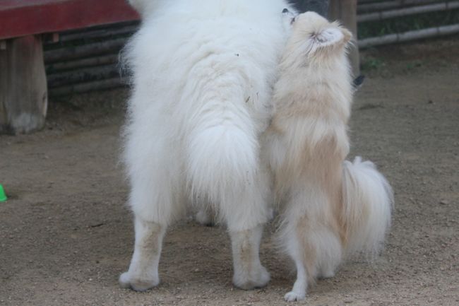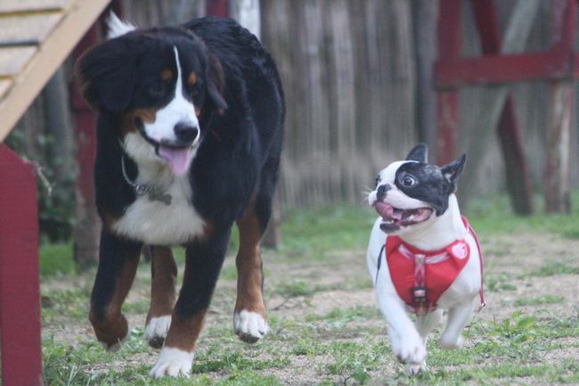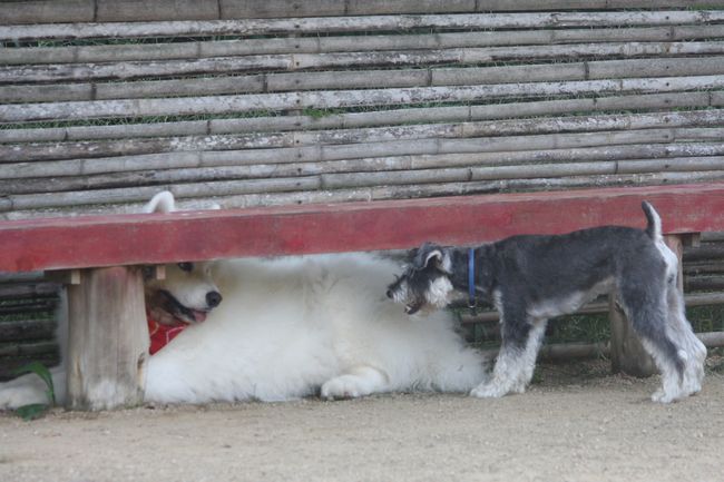 さっきジョンに怒られたバーニーズ君は、フレブル君の事を気に入ったようでずっと付いて歩いていました。