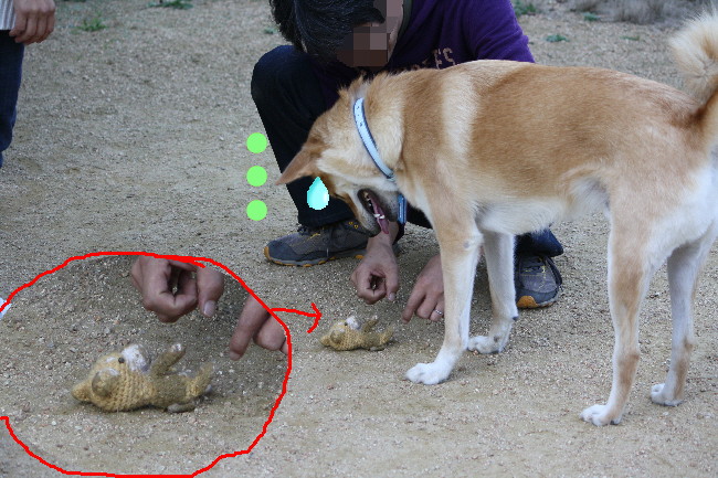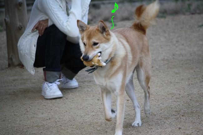 ご機嫌でぬいぐるみを咥えて飼い主さんの元に戻る時に、俺横取りしたんですけど(爆)ふく君は怒りませんでした。