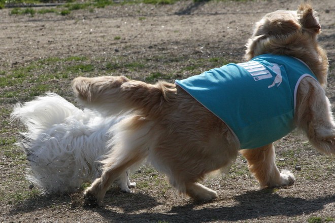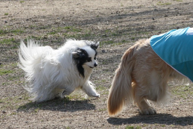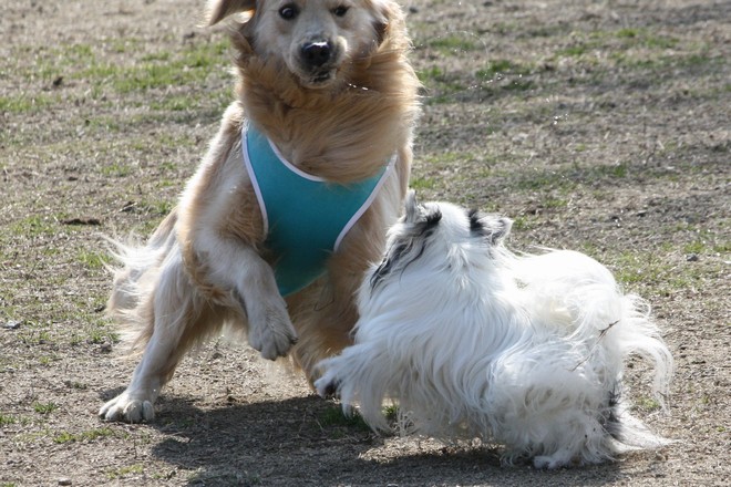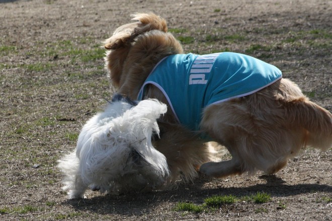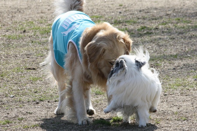 ジョンに蹴散らされたゴールデン君、今度はパピのところへやってきました。