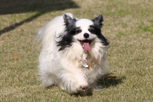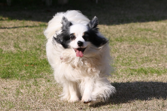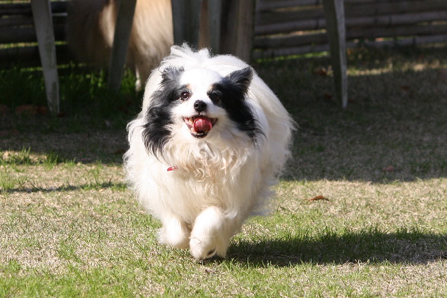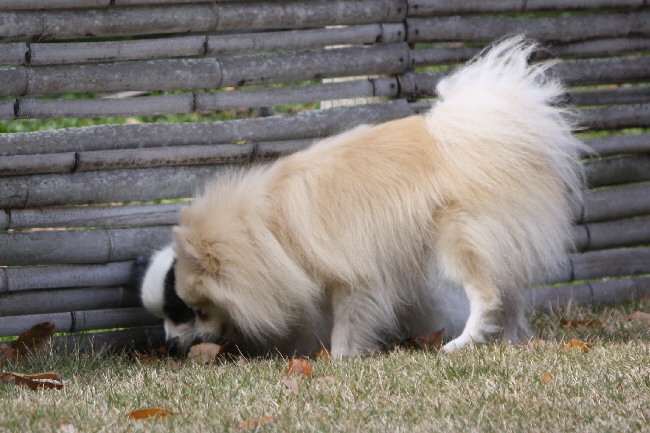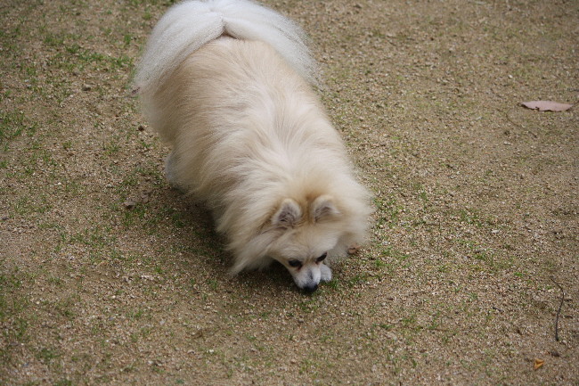走ってるジョンの後ろでパピは入念な匂いチェック。