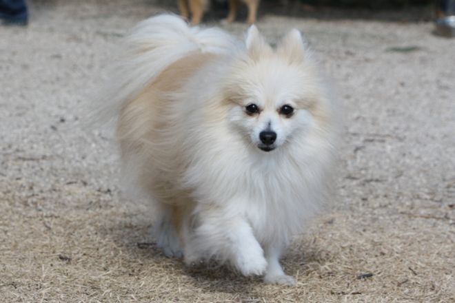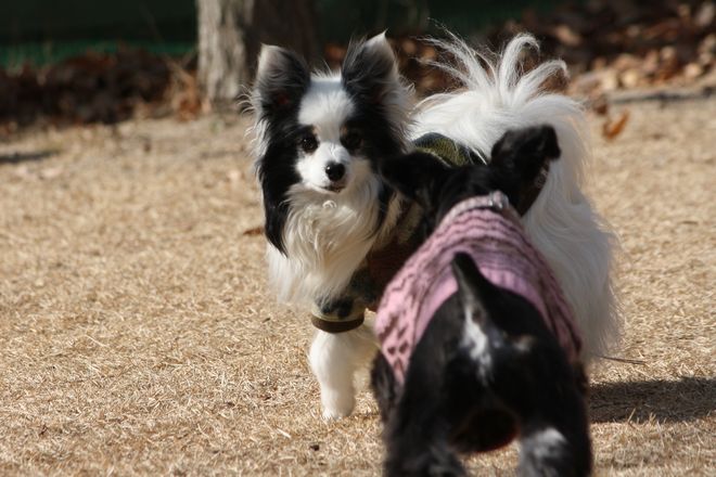 ジョンをどん引きしたマルチーズ君でしたが、パピには興味を持ったようでしばらく付いて歩いていました。