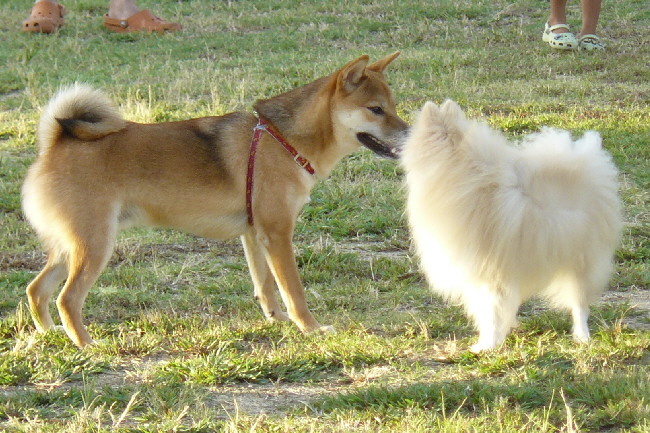 よく大き目なポメってスピッツと間違われると思うけど(特に白いコートの子)、一緒に見ると違いは歴然ですよね。