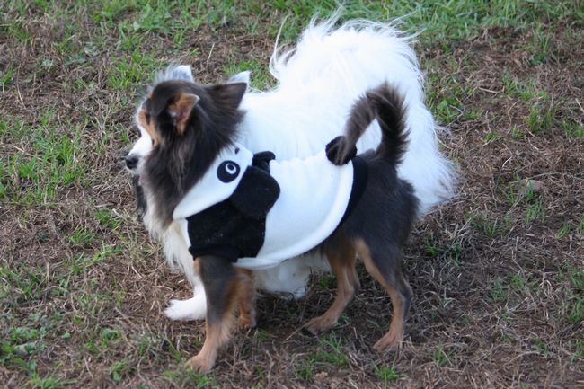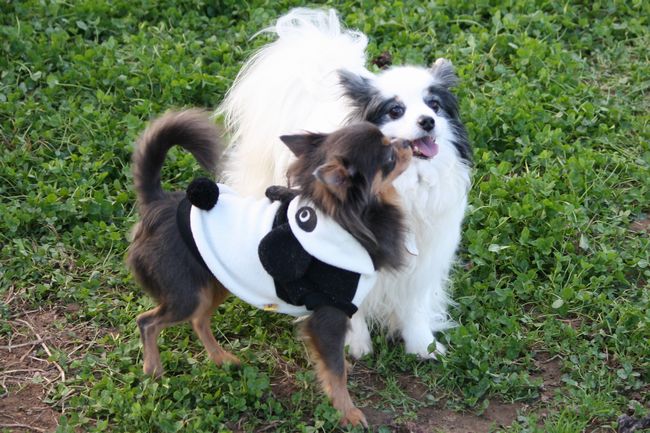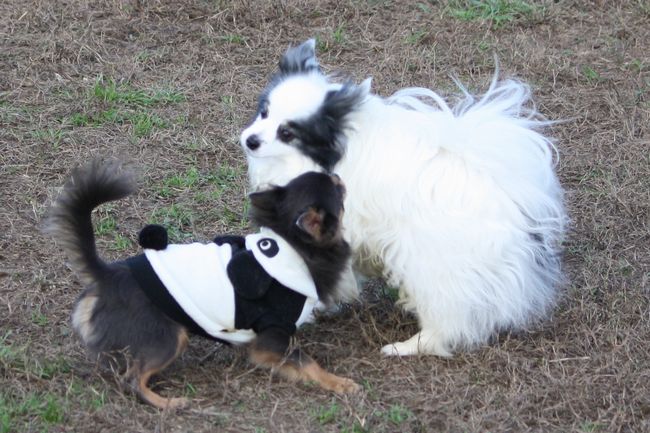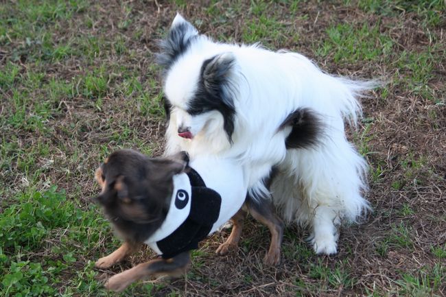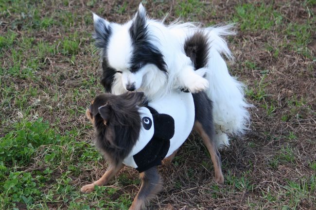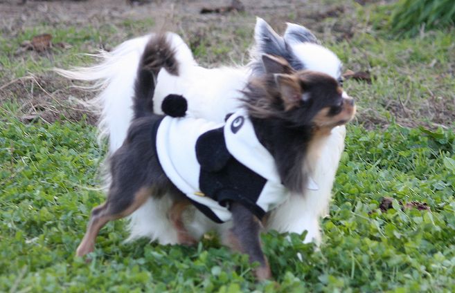 サイドバイサイドでパピちゃんを追跡するロンチー君の視線とパーカーのパンダが可笑し過ぎます。