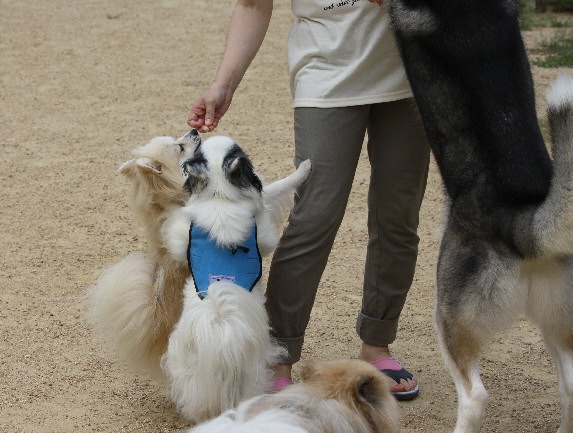オヤツを貰う時だけはこうしてクオーレ君のママさんに甘えてたパピですけど、オヤツを持ってないとわかると呼ばれても素無視してました(笑)