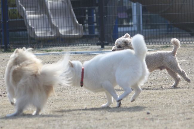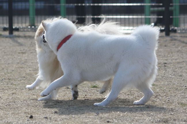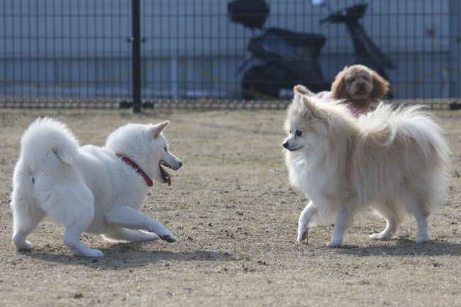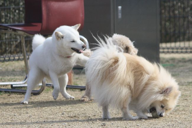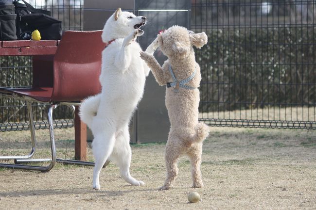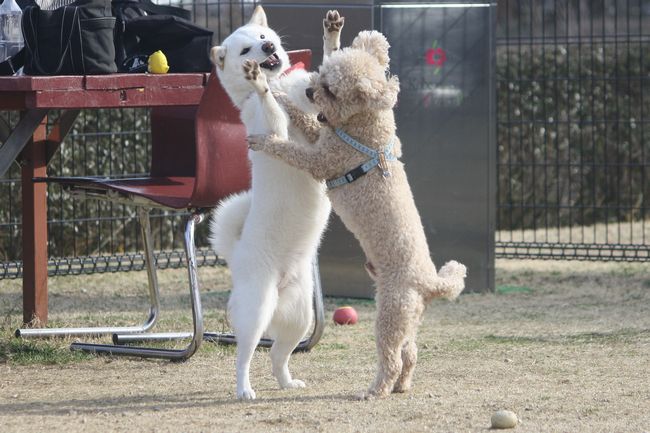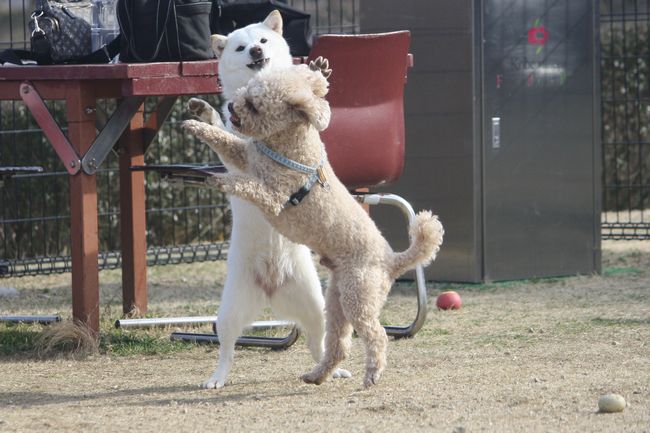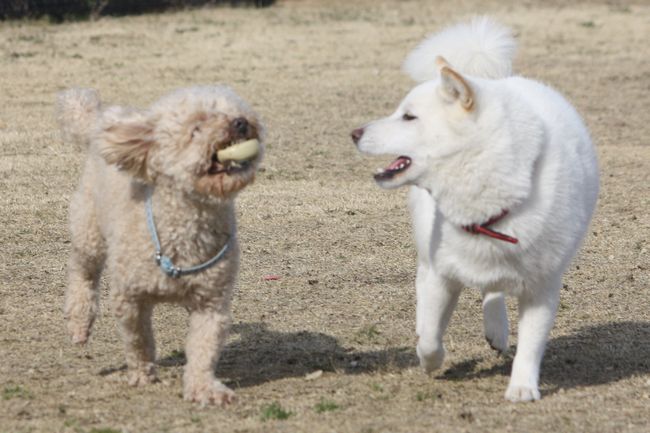 ジョンの次はボール遊びをしていたトイプー君を、またまたターゲットにした白柴ちゃん。