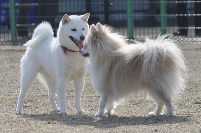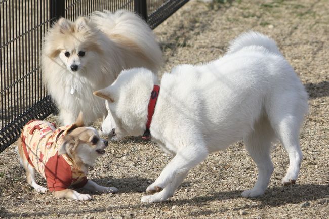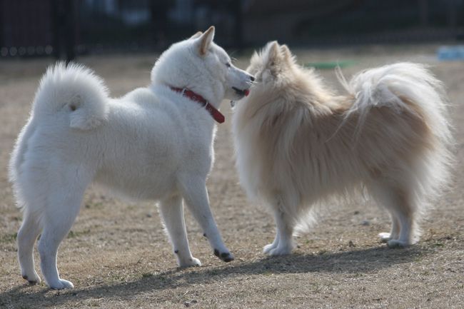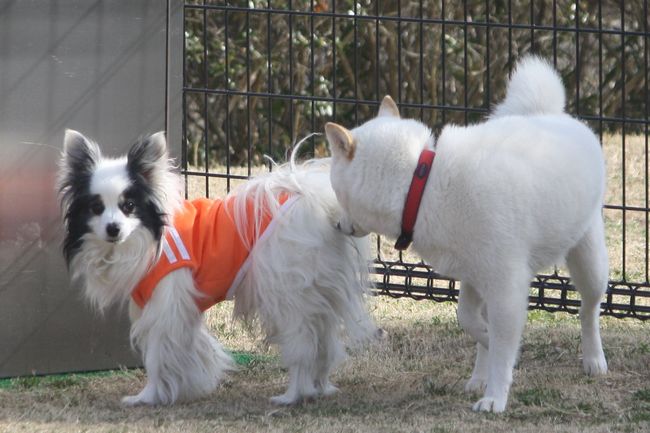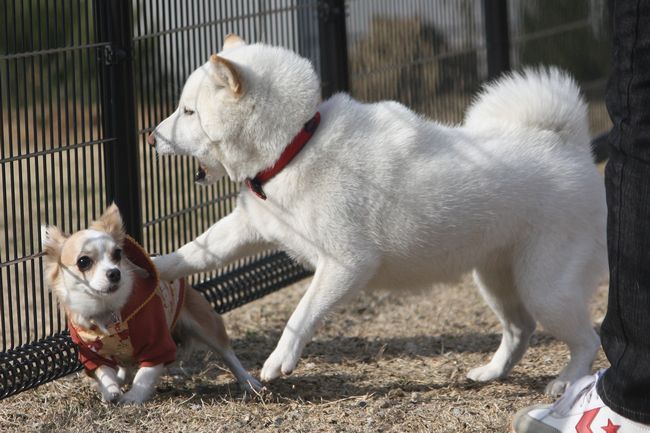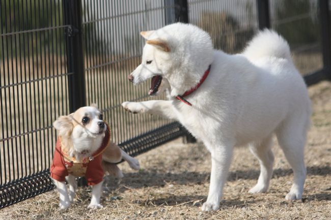 チワワ君、白柴ちゃんの迫力にちょっと怖がっています(^^;)