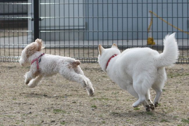 早速白柴ちゃんに追いかけられる白いトイプー君(笑)