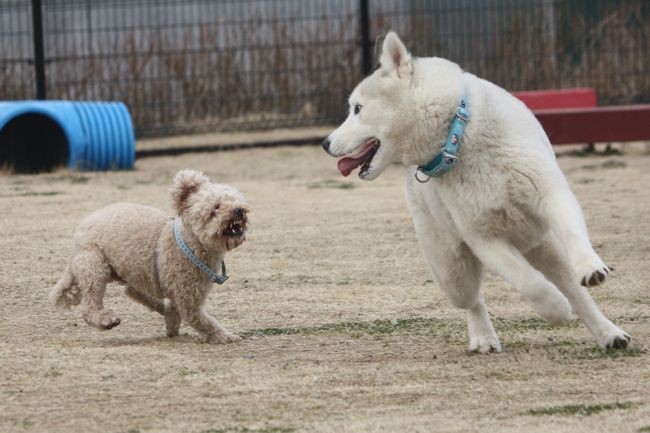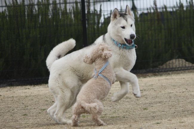しかしどう言う訳かさっきまで温厚だったトイプー君が何故かハスキー君は駄目だったようで、近付いてくる度にこうして向って行ってました。