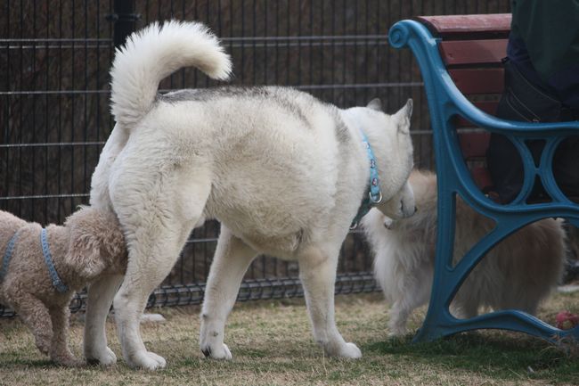 パピとハスキー君の挨拶の時はちょっとドキドキものだったけど、この後はお互いのお尻の匂いを嗅ぎ合っていたので安心しました(^-^)