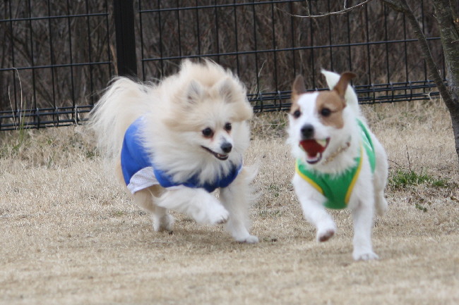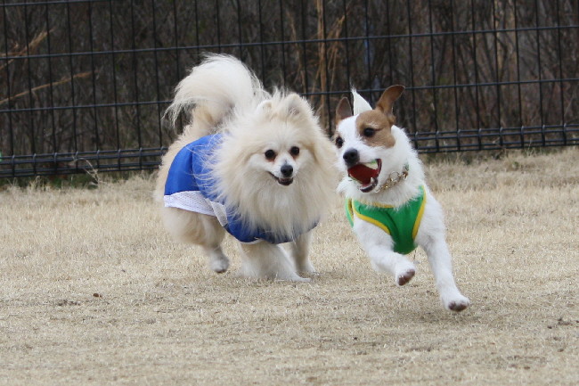 ボール投げをして貰っているジャックラッセルテリア君を追い回すかけるジョン