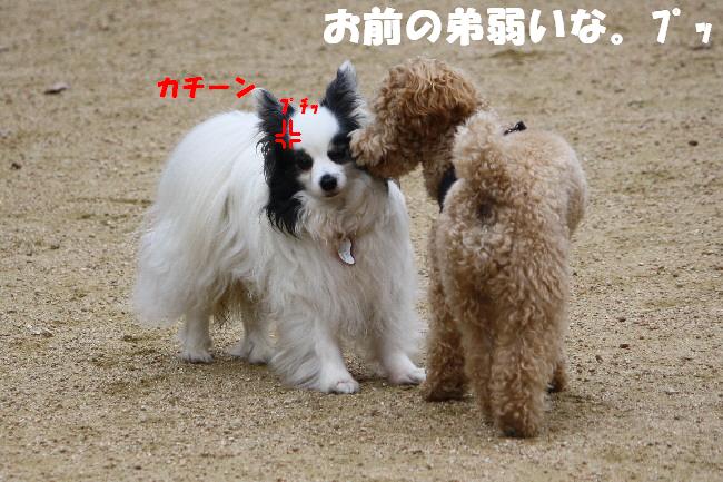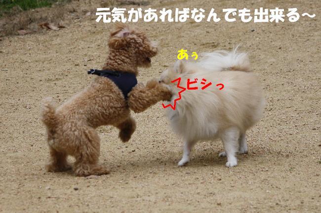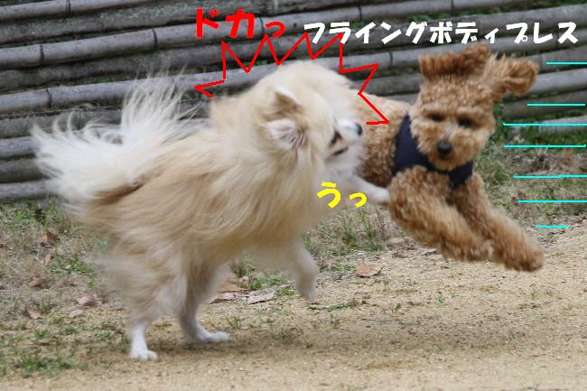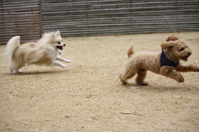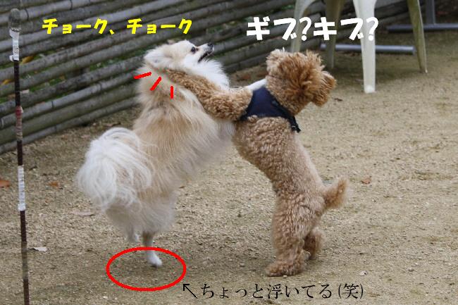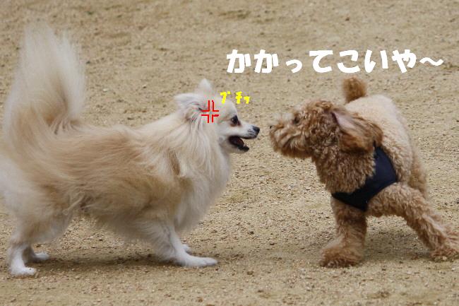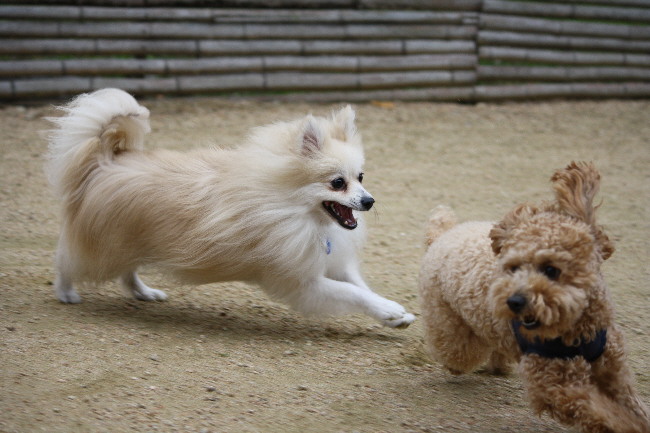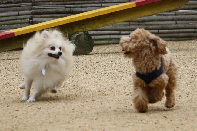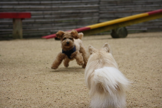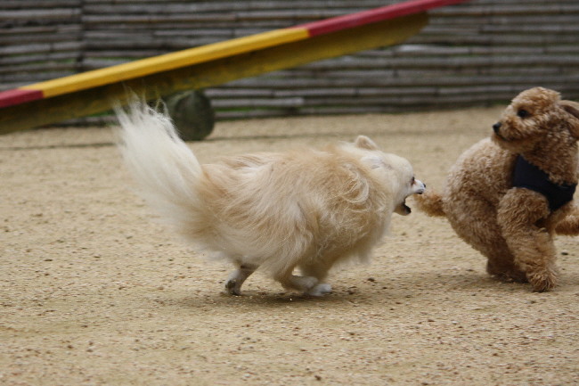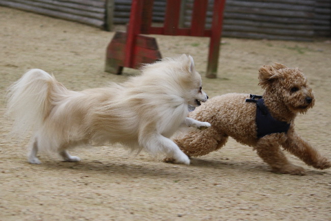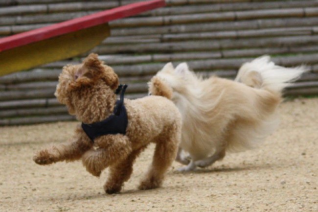 写真を見てるだけなら、嫌がるトイプー君をジョンが一方的に追い回してるみたいでしょ?