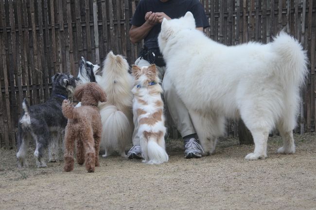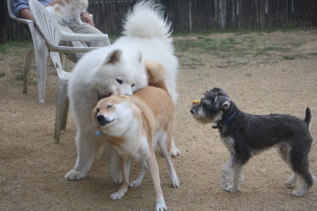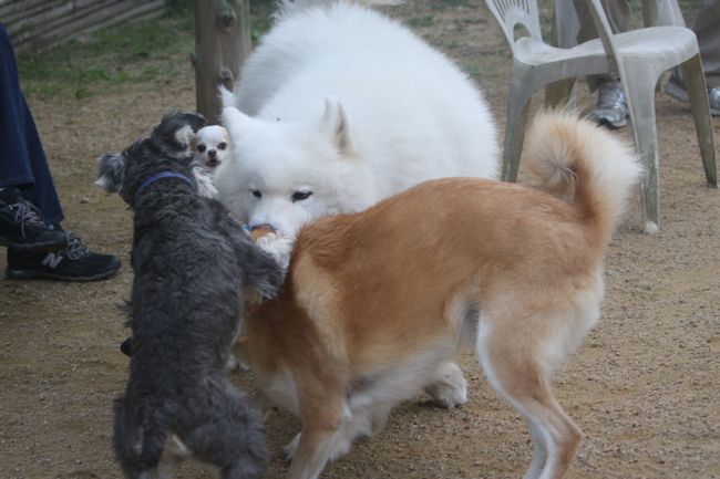 ふく君達が取っ組み合いをしている頃、向こうではバレンパパさんがジョンとパピにオヤツを下さっていました。