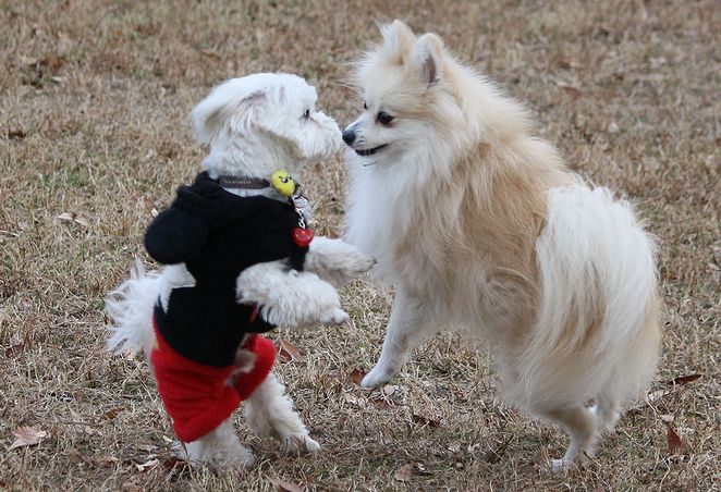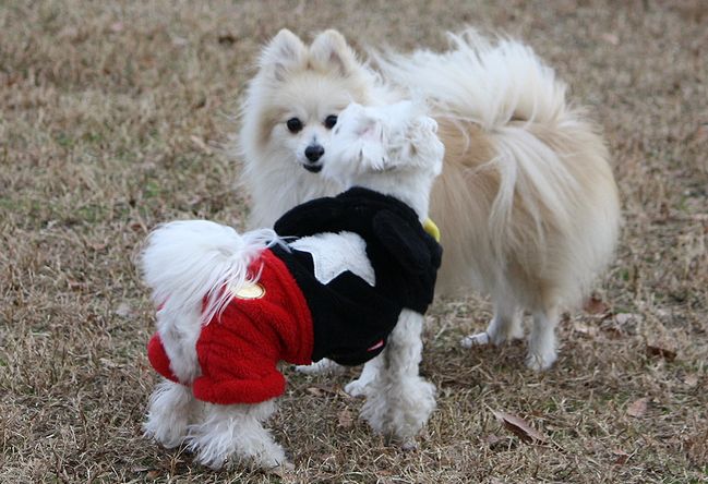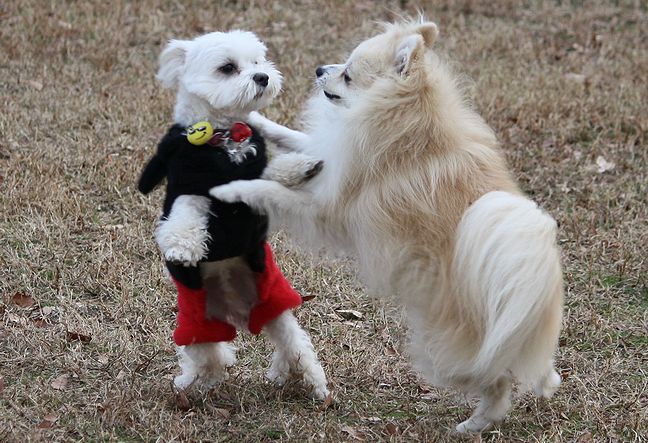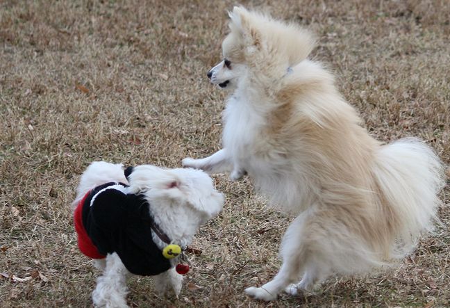 しかしこのマルチーズ君、小さいのに中々勇敢でデカポメジョン相手に一歩も退かないどころか互角の戦いを繰り広げていました