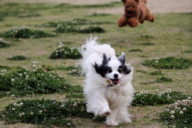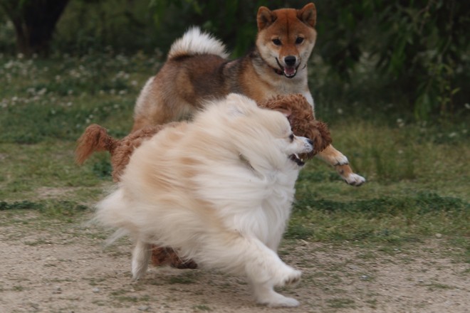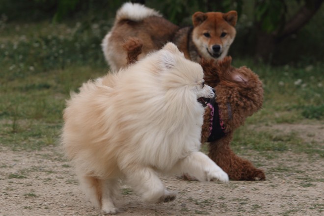 パピの後ろのトイプー君、見事な飛行犬振りでしょ~