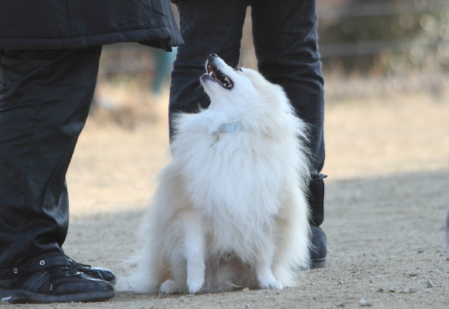 そうこうしてたらランの外にワンワンと威勢のいい白ポメ君がやってきました。