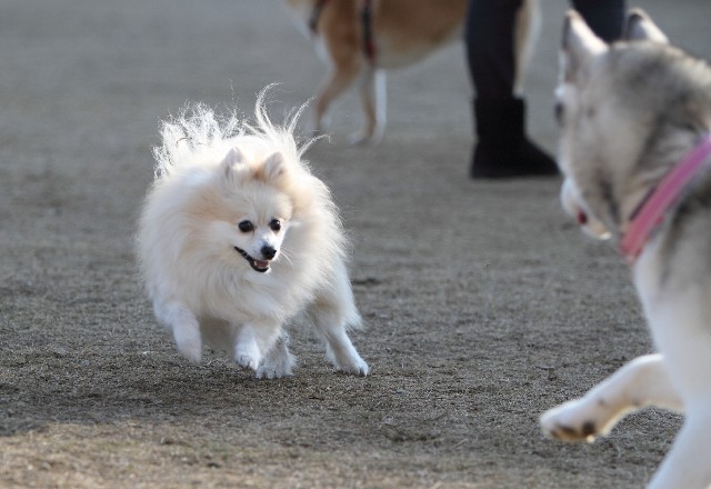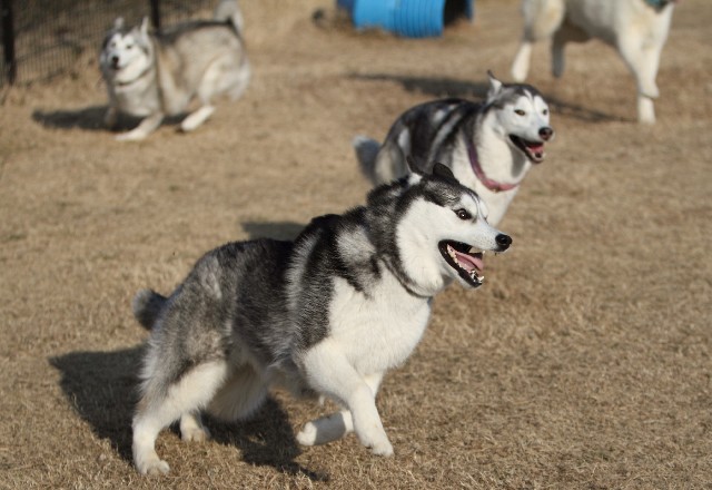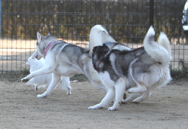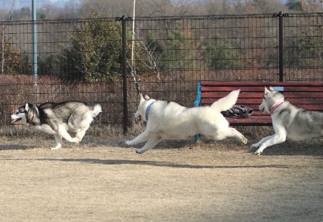 白ポメ君がランから出て行った後も、すっかりテンションが上がってしまったハスキー軍団はそのまま追いかけっこを始めました。
