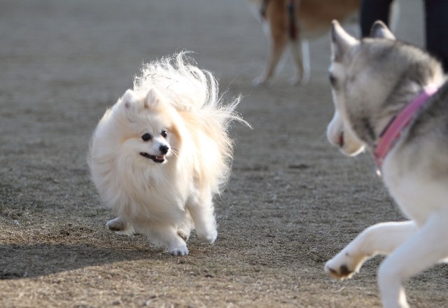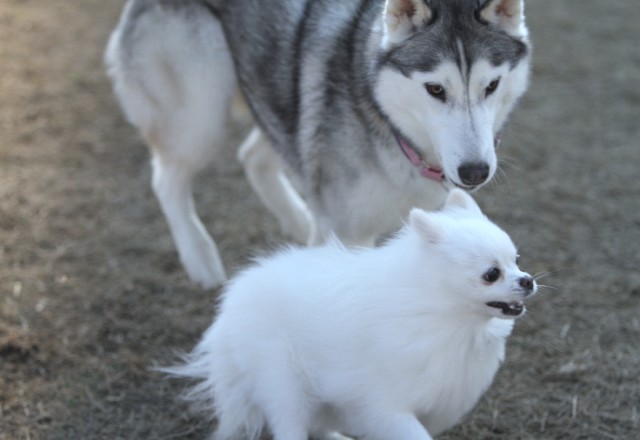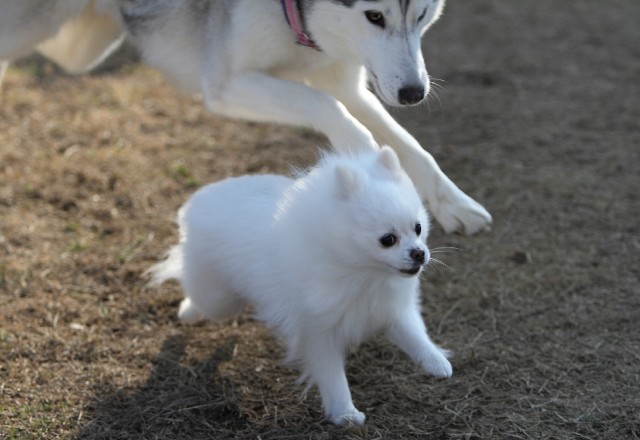 白ポメ君が去ってから、しばらくジョンとハスキーちゃんが遊んでいると