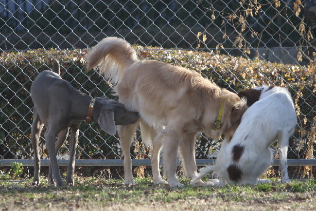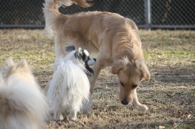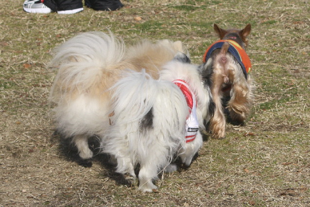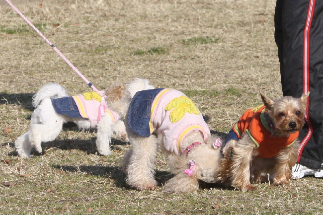 写真だけ見ていると仲良く追いかけっこをしている様にも見えますが、ジョンは全くマルチーズ?ちゃんに気が付いて無かったようです(笑)