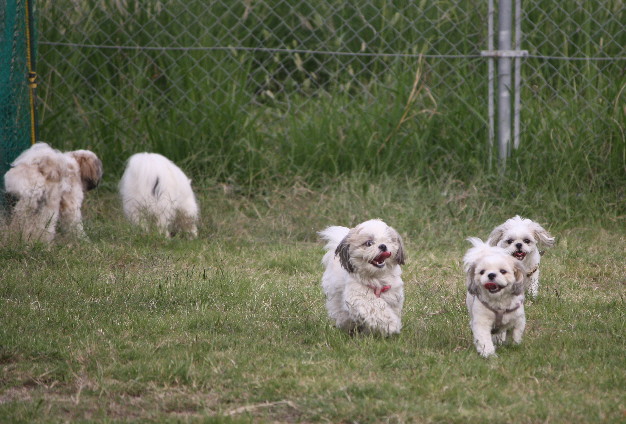 自分が今まで見てきた二頭以上の多頭飼いのところって、もうそこでコミュニティーというか仲間意識が出来ていて他所の子をよく吠えるワンコが多かったけど、シーズーと言う犬種のせいなのか飼い主さんの躾でなのかはわからないけど、ここの四頭は全然吠えもせずに上手に遊んでいました(^-^)