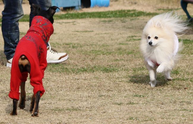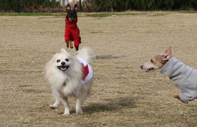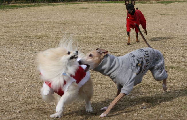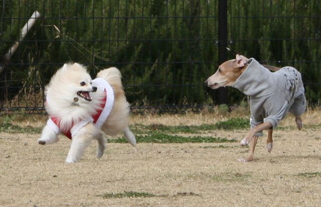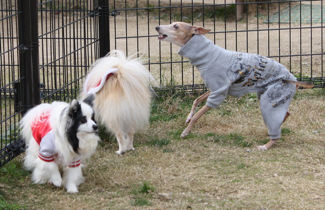 このイタグレ君、こうして追いかけっこをしている時もずっとジョンに吠えていたので、パパさんに教育的指導を受けていました(笑)