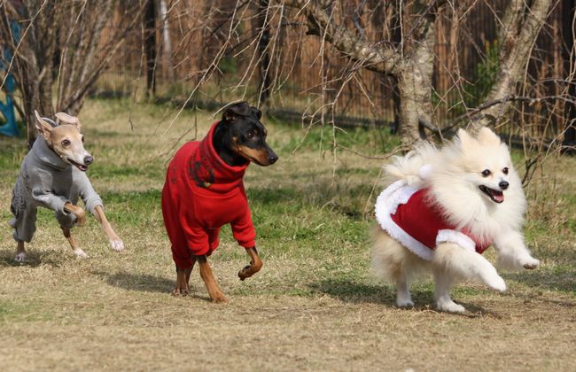 ジョンは毛をなびかせて速そうに走ってるけど、イタグレ君とミニピン君は止まっている様に見えます。