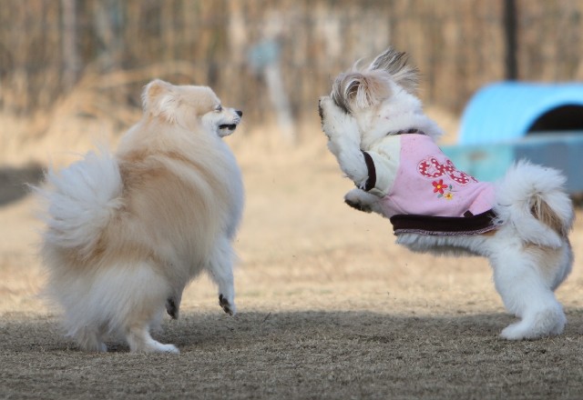 ポメ×シーズー「もうこっちに来んなよ、毛玉」