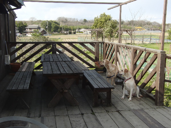 さっきランでボール遊びをしていたラブ君たちは、飼い主さんが店内で食事をしている間こうして大人しく待っていました。