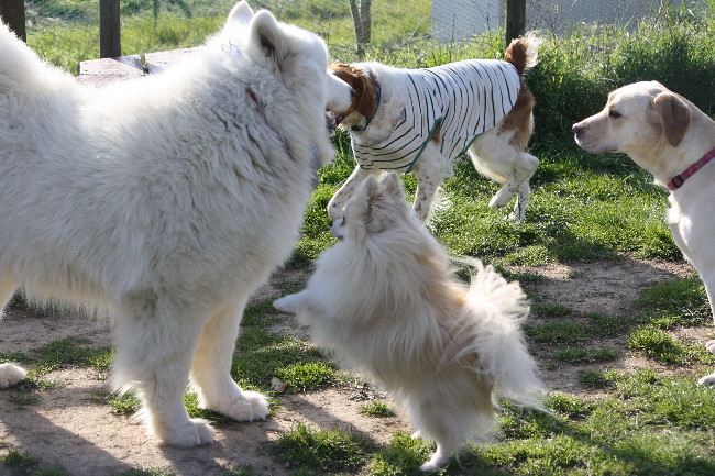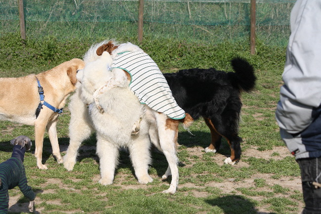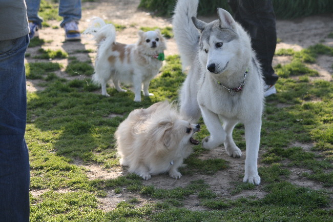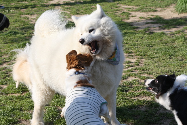 他の大型犬にしてみたら、見慣れない巨体が来たから、どちらが上なのかわからせてやろうってとこなんでしょうね?
