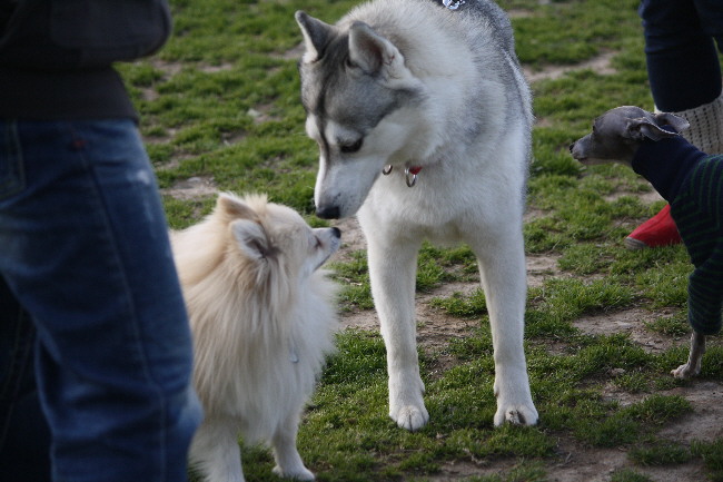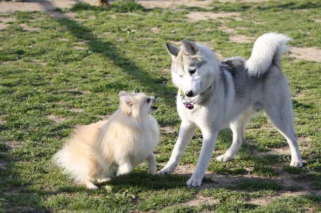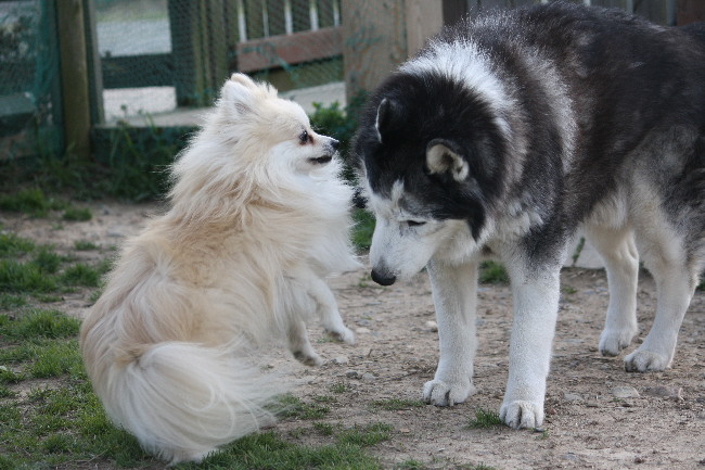 可愛いですよね~困った顔のハスキーちゃんに必死で語りかけてるジョン君