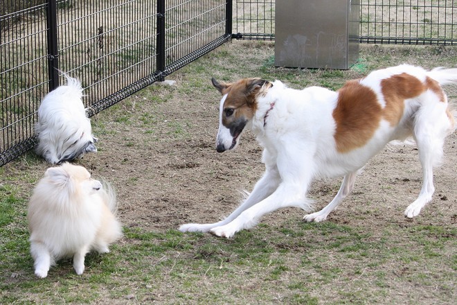 ボルゾイ君にジョン君が誘われてる時、パピちゃんの全く意に介さないで匂い嗅ぎに必死になってる姿がなんともたまりません(笑)