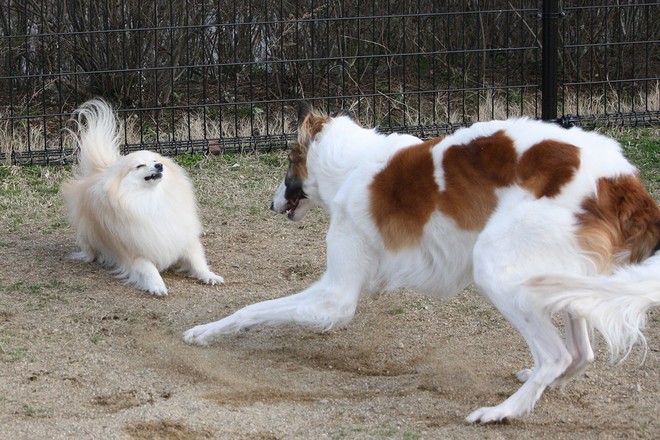 ジョンがボルゾイ君に誘われている時は全く気に留めてないんだけど、パピって誰かが喧嘩してるとすっ飛んで喧嘩に混じるんですよ(爆)