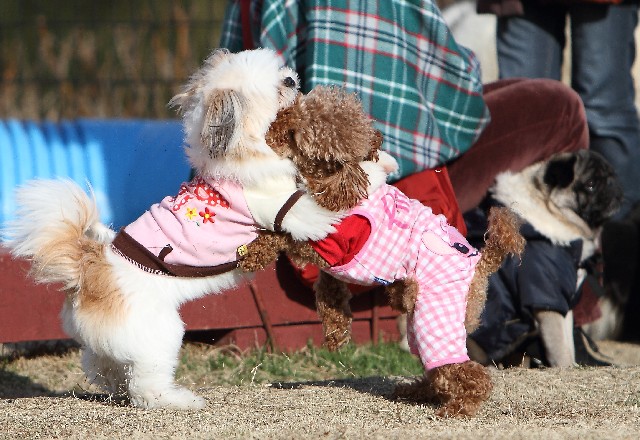 この日もまたいつもの様に相撲をとるポメ×シーズーmix君とトイプー君