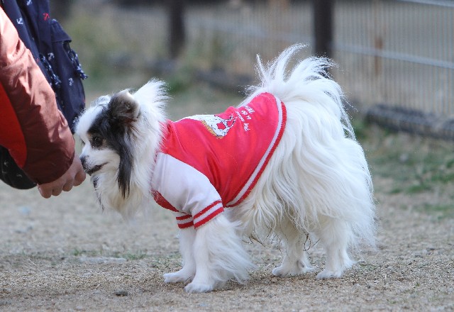 パピはコーギーのパパさんの手を匂い嗅ぎ。
