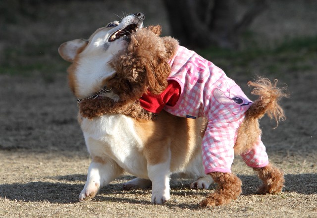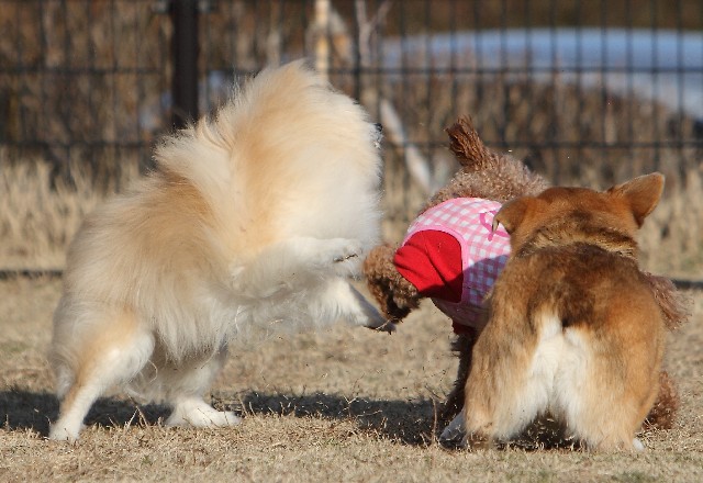 トイプー君が遊びから抜けて背を向けていた時に、ジョンと遊んでいたコーギー君が勢いよくぶつかってしまい、不意に勢いよくぶつかられてビックリしたトイプー君がジョンに怒って喧嘩に発展してしまいました。