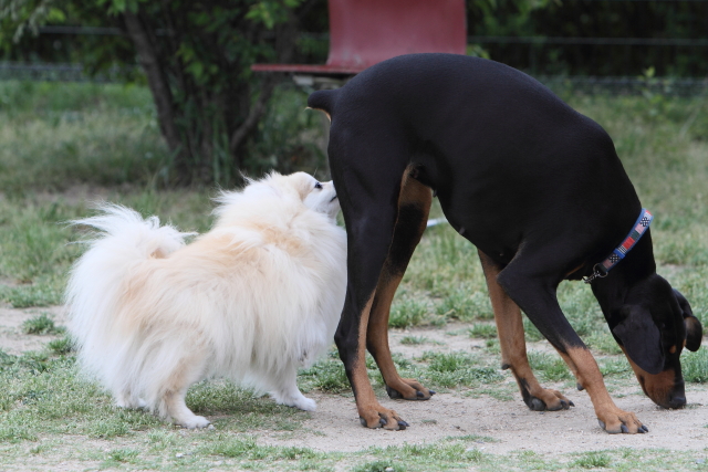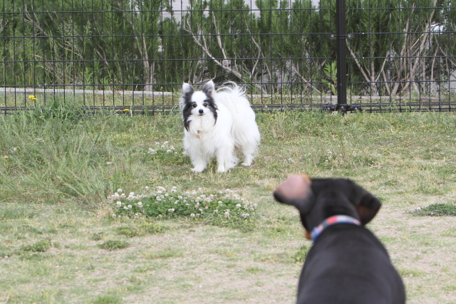ダックス君へのマウントをどうにか止めさせた時に少し離れたところでは、パピとドーベルマンちゃんが見詰め合っていました。