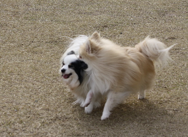 迷惑そうなパピちゃんの顔と、楽しそうなジョンちゃんの対照的な顔がなんともいい♪(^^)
