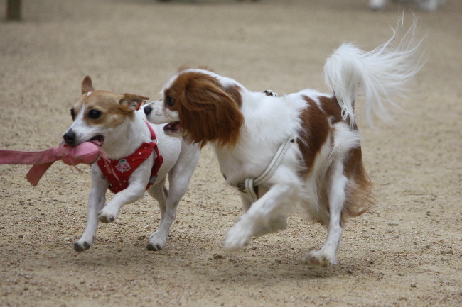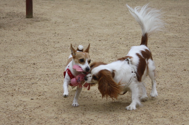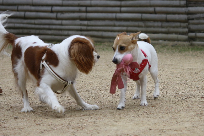 このキャバリエちゃん、おもちゃ遊びが好きなようで、ハナちゃんがおもちゃで遊んでいると…